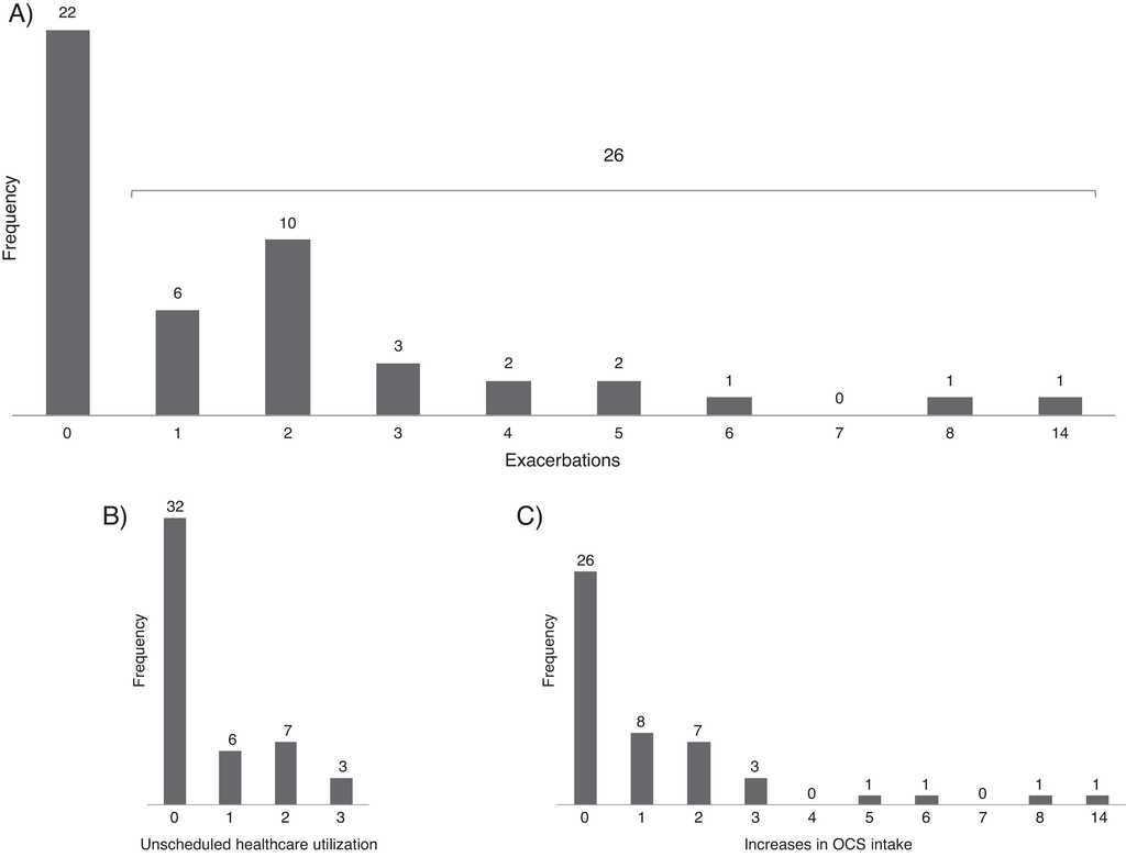 Figure 1. Distribution of the number of exacerbations (A) unscheduled healthcare utilization (B) and increases in OCS intake (C) in the 12-month follow-up period.