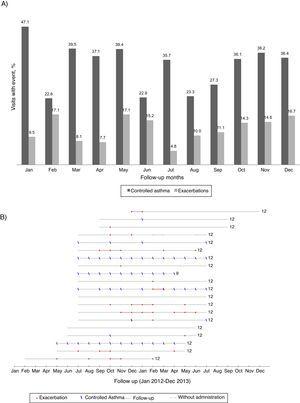 Figure 2. (A) Percentage of visits reporting controlled asthma and exacerbations according to the month of the year (all patients included). (B) Reports of controlled asthma and exacerbations during follow-up, per patient. In (B) numbers on the right indicate total months of follow-up; continuous grey lines represent the follow-up period and dashed grey lines interruptions in omalizumab treatment; red dots represent visits with report of exacerbation and blue dashes visits with CARAT global score >24–data from the 20 patients treated with omalizumab in Centro Hospitalar São João, EPE.