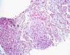 In the meanwhile, there was clinical deterioration with the patient presenting a moderate obstructive ventilatory syndrome (FEV1=53%) without bronchodilator reversibility, slight hipoxemia (Pa02=71.5mmHg) and significant desaturation in the six minute walk test (S02=90---95%, 500m). The patient was then referred for pulmonology consultation and a second transthoracic core biopsy was performed revealing features compatible with OP, namely chronic inflammation and intra-alveolar organizing fibromyxoid polyps (Fig. 2). The diagnosis of COP was established, since no aetiology related to OP was found. The patient started high dose of corticosteroid therapy (equivalent dose of prednisolone 1mg/Kg/day), but as there was no clinical improvement and tapering glucocorticoid therapy was not possible, four months later, azathioprine was added. The dose of azathioprine was not increased above 150mg/day, and the cytotoxic drug was stopped, due to persistent exacerbations and hospital admission. Following discharge, azithromycin, 500mg on alternate days, was started as an adjuvant to steroid therapy (0,75mg/kg/day). Clinical and functional improvement followed and HRCT showed clearing of lung infiltrates (Fig. 3). It was possible to withdraw steroid therapy within a year and there was no evidence of relapse in the six months of the follow up. Azithromycin was maintained, and at this point the frequency of administration was reduced (500mg, three times per week). No adverse side effects were observed.