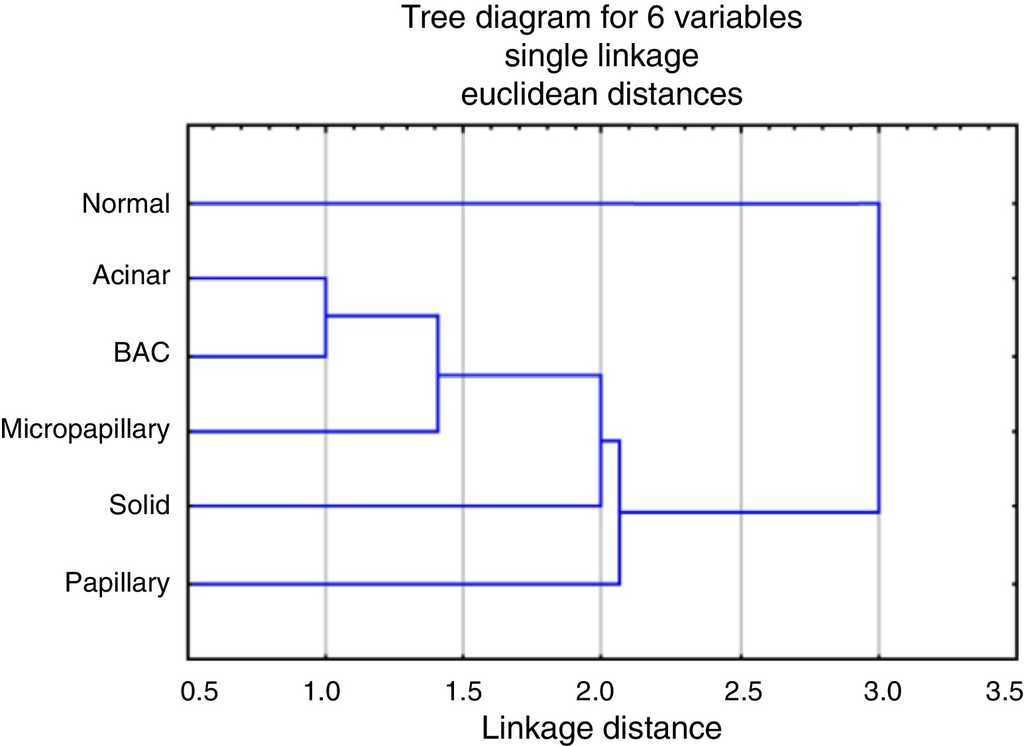 The analysis of the dendrogram clearly showed that adenocarcinoma is genetically different from normal tissue (Figure 2). Concerning the patterns, BA/lepidic and acinar are the more similar and papillary the most distinct or genetically separated pattern. By PCA analysis (Figure 3) we were able to identify three clusters: the first composed of papillary pattern adenocarcinomas; the second corresponding to solid; and the third to the group of acinar, BA/lepidic and micropapillary patterns.