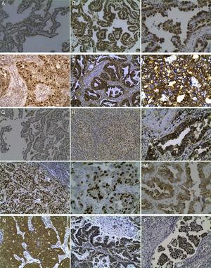Micropapillary patternMicropapillary pattern is characterized by small papillary tufts and is considered an aggressive adenocarcinoma, more than papillary pattern.59, 60, 61 There were three differences with papillary patterns concerning expression of ERCC1, RB and TTF1. RB expression was downregulated in micropapillary, being almost non-existent. Some authors said that downregulation of RB leads to the progression of cell cycle.62 Micropapillary pattern had a basal level of ERCC1, this indicating that DNA repair may occur with NER activation. TTF1 was overexpressed in this pattern and, according with what has been said before, this fact indicates lung cancer progression and development after the terminal respiratory unit. These considerations are consistent with our results because downregulation of RB and TTF1 overexpression are responsible for cell cycle progression and basal level of ERCC1 allows DNA repair. This last consideration is very important to keep in mind in treating lung cancer.