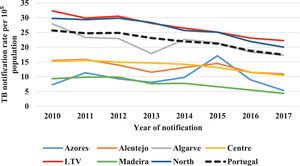 When comparing the regional declines in TB notification rates, we did not observe significant differences in Portugal. However, our results showed how those regions with higher notifications rates, mostly North and LTV, were also those with highest interannual declines. Similarly, regions with lower notifications rates (mostly Azores and Alentejo) were also the ones with lowest interannual declines.