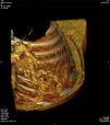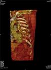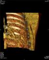 Face o achado radiográfico de «unilateral rib notching» foi realizada angio-TC torácica (tomografia computorizada com protocolo dedicado para estudo vascular), que revelou diminuição relativa de densidade do ramo esquerdo da artéria pulmonar (pós-injeção endovenosa contraste iodado) (fig. 3), dilatação e tortuosidade das artérias intercostais homolaterais (figuras 4, 6 e 7), reconhecendo-se «novelo» arterial (fig. 8) (parcialmente extrapleural, transpleural e intraparenquimatoso) drenado via transparênquima para o ramo da artéria pulmonar homolateral, associado a alterações do parênquima pulmonar adjacente traduzidas por bronquiectasias e bronquioloectasias de tração (fig. 5). Não foram identificados por TC critérios dimensionais compatíveis com hipertensão arterial pulmonar. As artérias brônquicas não apresentavam calibre aumentado.