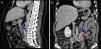 TAC abdominal com contraste, imagens sagital (A) e coronal (B) mostram baixa atenuação de massas císticas retroperitoneal tubulares, que são consistentes com a dilatação dos vasos linfáticos abdominais (seta azul). Linfonodo para-aórtico aumentado (seta vermelha).