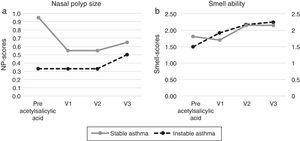 MethodsPatients with poorly controlled asthma, NDAIDs hypersensitivity and aspirin desensitization were included in the retrospective study. The data were compared to those obtained from patients with controlled asthma and aspirin therapy. Lung function, levels of asthma symptom control, asthma medication, the size of nasal polyps (NP) and smell function were evaluated over 18 months.