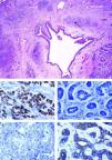 Histologically, the nodule located in the middle lobe was a collision tumor of 2.5cm diameter formed by a lung adenocarcinoma with a poorly differentiated grade (1.1cm×1cm) and a metastatic ACC (1.5cm×1cm) 0.2cm away from the primary tumor. We did not observe histological admixture or an intermediate cell population zone (Fig. 2a). A subpleural nodule of ACC was also observed in the right lower lobe (0.5cm). There was no evidence of vascular invasive tumor, the resection bronchial margin was negative and all the lymph nodes were free (Fig. 2). In the immunohistochemical work-up, one area consisted of glandular neoplasic proliferation with poorly differentiated areas and large cells with severe cytologic atypia TTF-1 positive (Fig. 2b) and C-kit (CD117) negative (Fig. 2d). The other area was formed by basophil epithelial nests with the presence of mucoid material inside. These cells showed a moderate grade of cytologic atypia and were positive for C-kit (Fig. 2e) and negative for TTF-1 (Fig. 2c).