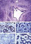 Histologically, the nodule located in the middle lobe was a collision tumor of 2.5cm diameter formed by a lung adenocarcinoma with a poorly differentiated grade (1.1cm×1cm) and a metastatic ACC (1.5cm×1cm) 0.2cm away from the primary tumor. We did not observe histological admixture or an intermediate cell population zone (Fig. 2a). A subpleural nodule of ACC was also observed in the right lower lobe (0.5cm). There was no evidence of vascular invasive tumor, the resection bronchial margin was negative and all the lymph nodes were free (Fig. 2). In the immunohistochemical work-up, one area consisted of glandular neoplasic proliferation with poorly differentiated areas and large cells with severe cytologic atypia TTF-1 positive (Fig. 2b) and C-kit (CD117) negative (Fig. 2d). The other area was formed by basophil epithelial nests with the presence of mucoid material inside. These cells showed a moderate grade of cytologic atypia and were positive for C-kit (Fig. 2e) and negative for TTF-1 (Fig. 2c).