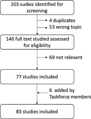 First, a comprehensive literature review was conducted. The Pubmed database was searched using the following keywords: (“LC screening” OR “LC early detection”) AND (“implementation LC screening” OR “LC screening programs” OR “adherence to LC screening” OR “effectiveness of LC screening”). This review included randomised controlled trials, clinical trials, meta-analyses, and systematic reviews written in English and published from 2010 until 2023. Two reviewers screened the titles and abstracts to determine their eligibility (further details are provided in Appendix A). The bibliography was completed using the articles suggested by experts in their respective fields. Of the 203 initially identified articles, 146 met the inclusion criteria. Subsequently, two independent reviewers read the full text of all articles and determined that 77 articles were relevant to this initiative. These relevant articles were then shared with all the task force members.