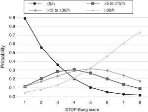 Table 3. Predicted probabilities of each STOP-Bang score for different AHI levels (n, number of patients in the AHI group who scored the STOP-Bang score indicated; percentage out of the 215 patients).