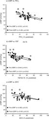 ResultsEntire groupFrom pre-exercise to post-exercise, COPD (n = 24) demonstrated significant increases in cSBP (pre vs. post, 126.9 ± 19.8 vs. 133.6 ± 15.8, p = 0.01) and cDBP (pre vs. post, 74.8 ± 8.4 vs. 81.5 ± 9.5, p < 0.01) with a significant decrease in pDBP (pre vs. post, 68.2 ± 7.6 vs. 64.9 ± 8.4, p = 0.02). However, other central hemodynamic parameters including AP, PWV and AIx were not altered (p > 0.05). In addition, pulmonary function parameters including FEV1, FEF25−75 and MVV were associated with cDBP at pre- and post-exercise (Fig. 1), however, these measures of lung function were not related to cSBP, AP, PWV and AIx (p > 0.05).