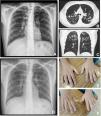 Panel A, B and C: Chest x-ray and thoracic computed tomography showed cylindrical bronchiectasis with wall thickening associated with a tree-in-bud micronodular pattern; Panel D: Chest x-ray with radiological improvement, after CF therapy was initiated; Panel E-F: severe weakness of upper limbs (worse in the upper right limb with muscle atrophy).