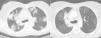 A. CT scan (lung window) shows multiple peripheral poorly defined areas of focal consolidation, very suggestive or organizing penumonia. B. CT scan (lung window), three month later shows resolution of peripheral areas of focal consolidation, but persistence of parahilar consolidation because of radiation fibrosis. Note the bronchiectasis and volume loss and the sharp demarcation between normal lung tissue and areas of fibrosis.