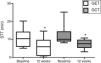 In relation to the MCT analysis, no differences were observed between the baseline evaluations of the training groups (p>0.05). There was a significant reduction in the SST values after 12 weeks in GET and GCT (p=0.03) (Fig. 2), but no interaction between type of training and SST decrease (p=0.97) and no differences between groups were observed on the magnitude of SST changes after interventions (p=0.97).