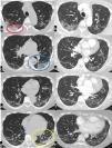 In the right lower lobe a part-solid ground glass attenuation with a coexisting minimal crazy paving pattern, is present beneath the pleura (c; red ellipse) in the apical and postero- basal segments.