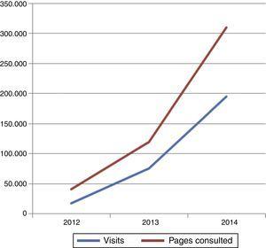 Fig. 1. Evolution of visits and pages consulted in the PJP webpage over the past three years.