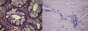 Análise histológicaTodos os doentes tiveram confirmação histológica do diagnóstico de vasculite. Dois foram sujeitos a biopsia cutânea, um a biopsia da mucosa cólica e o quarto foi sujeito a biopsia cutânea e da mucosa cólica. As biopsias da mucosa cólica mostraram aspetos de colite eosinofílica ativa (fig. 2) e as biopsias da pele revelaram aspetos de vasculite eosinofílica em dois doentes e o aspeto típico do granuloma de Churg-Strauss noutro.